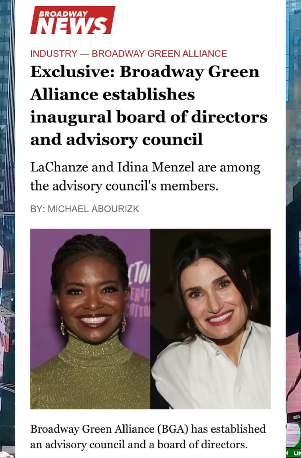 Juliette has been appointed as a member of the BGAβs Inaugural Advisory Council! Introducing fellow council members, LaChanze, Idina Menzel and more, βthis announcement marks the first formal governing bodies of the 17-year-old industry initiative dedicated to educating, motivating and inspiring the theater community to implement environmentally friendlier practices.β